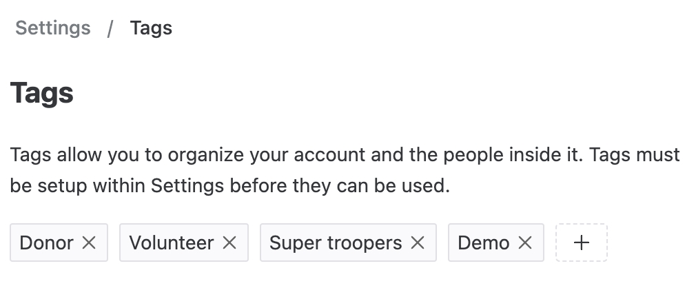 Tags must be created before they can be used, and they cannot be renamed. When you delete a tag, it will remove that tag from all People who have that tag.