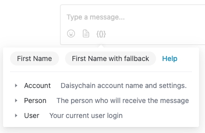 You can insert variables into messages by clicking the curly braces under the message you are crafting.